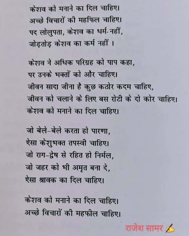 तप सम्राट केशुलाल जी महाराज के जीवन से प्रेरित भक्त राजेश सामर की कविता “केशव-स्तुति” में बताया गया है कि गुरु केशव को सच्चा सम्मान तभी मिलेगा जब हम अच्छे विचार, अच्छे कर्म और सेवा की भावना व्यवहार में अपनाएंगे। केवल पूजा-पाठ या कर्मकांड ही नहीं, हमें जरूरतमंदों की मदद, तप और त्याग को भी अपनाना चाहिए।